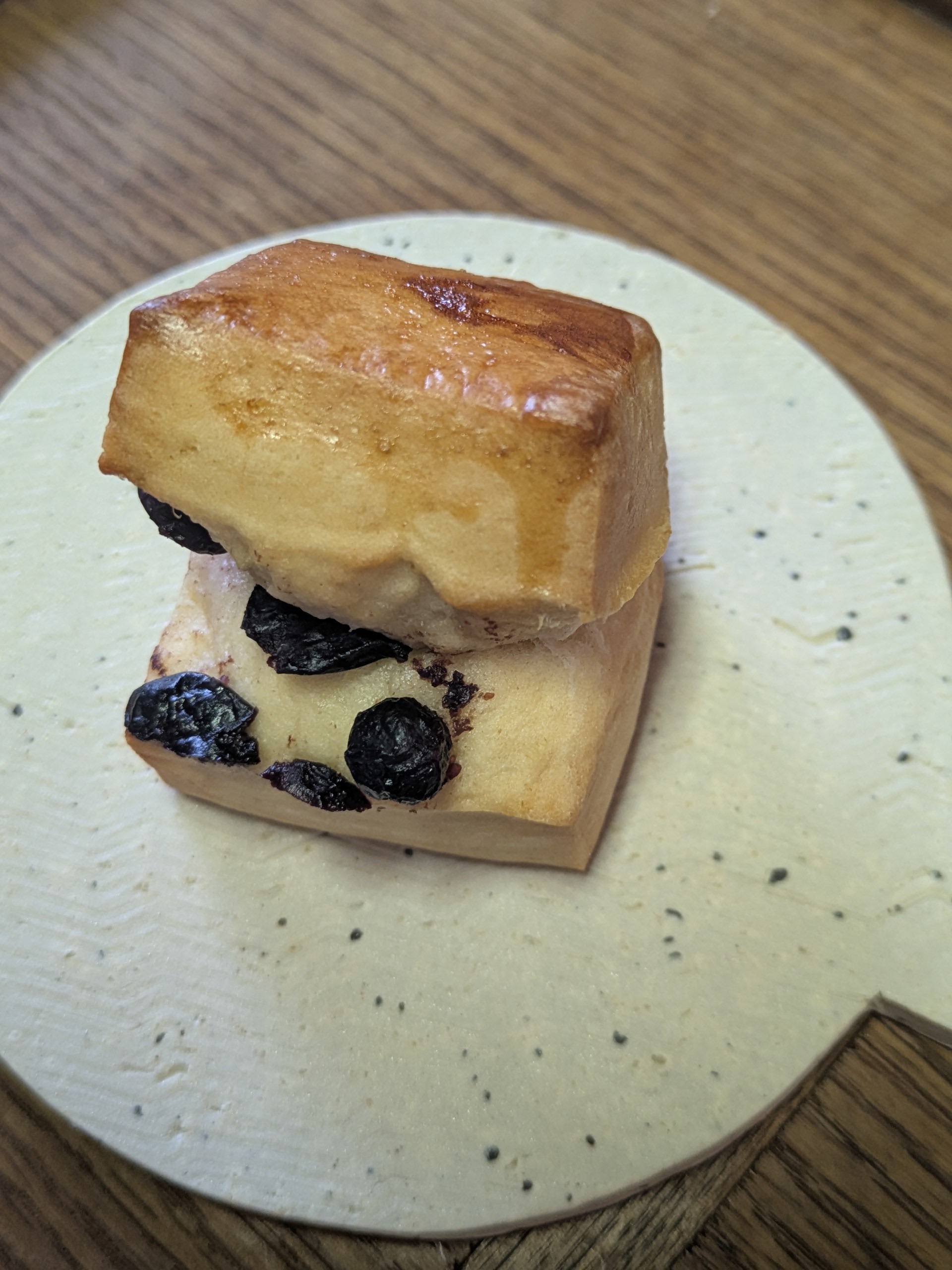 発酵スコーン。今回は最長の3日間寝かせました。こちらのスコーン、我ながらうまいです。ベーキングパウダーのスコーンもサクサクしてて美味しいですが、発酵系は、強力粉を使用している事もあり、弾力があります。あと、パンのような甘い風味が国産バターのミルキーさと相まっておいしいですね。